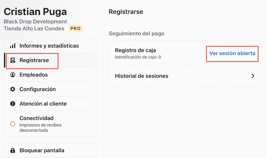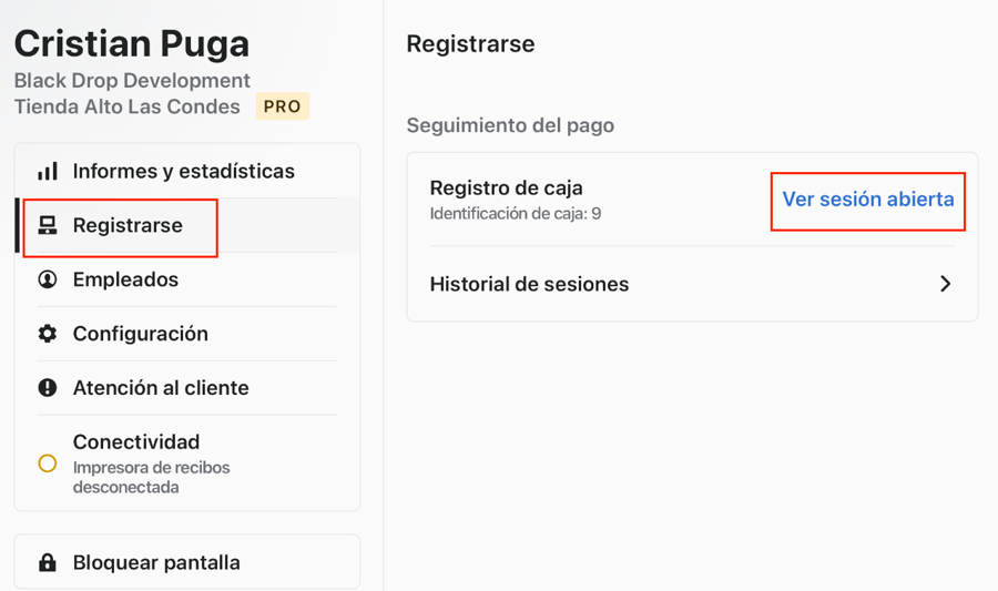 La caja ya fue habilitada y abierta para el uso del día. Para validar que esta operativa nos debe mostrar "Ver sesión abierta".