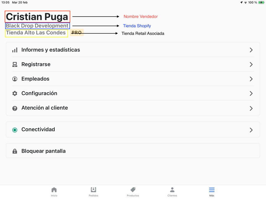 Para confirmar la cuenta que está logueada, presionamos el icono ubicado en la parte inferior "mas" y, en la parte superior izquierda, veremos el nombre del vendedor, la tienda Shopify y la tienda asociada.