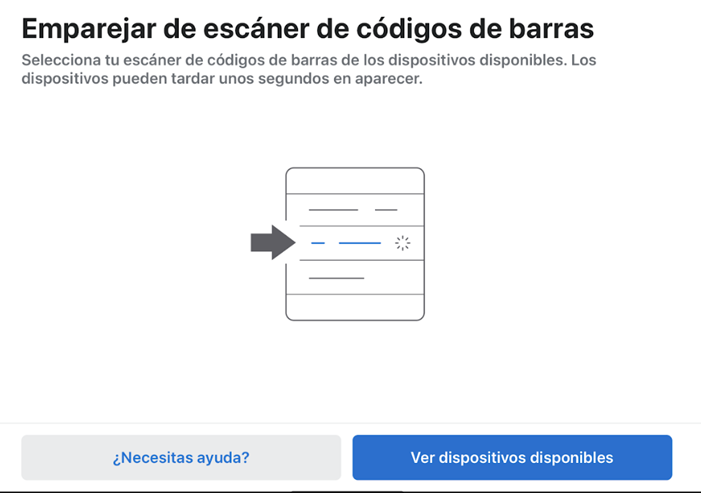 Seleccionar el escáner de Código, para eso debe tocar en “ver dispositivos disponibles” y seleccionar Socketscan S720, luego de eso verificar que los dispositivos estén conectados en el menú ajustes – Bluetooth del iPad