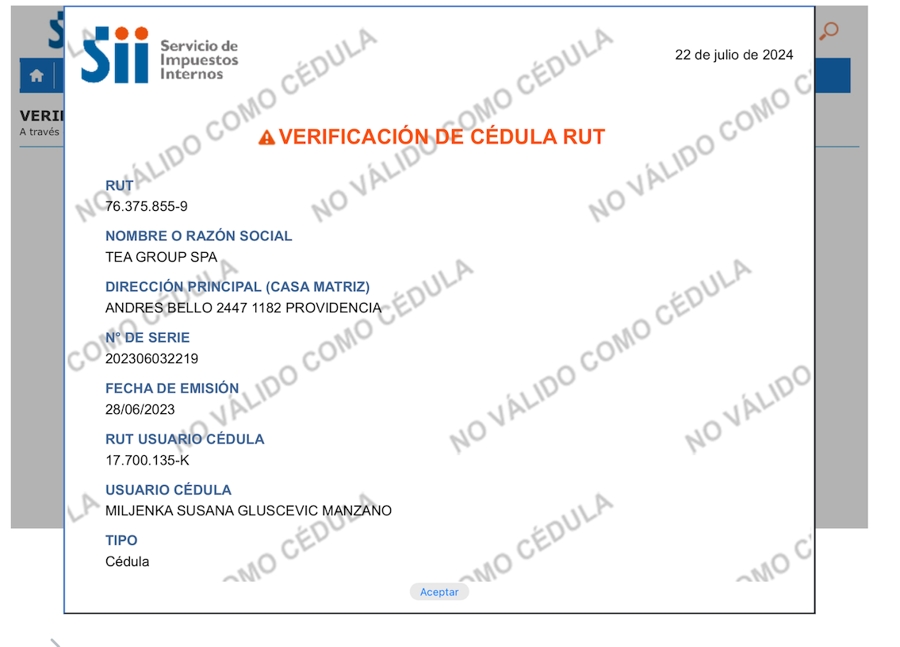 Cliente debe mostrar documento de SII (e-Rut) a su nombre para hacer una compra en nombre de la empresa, este puede ser fisico o digital. De lo contrario no podemos ofrecer factura.